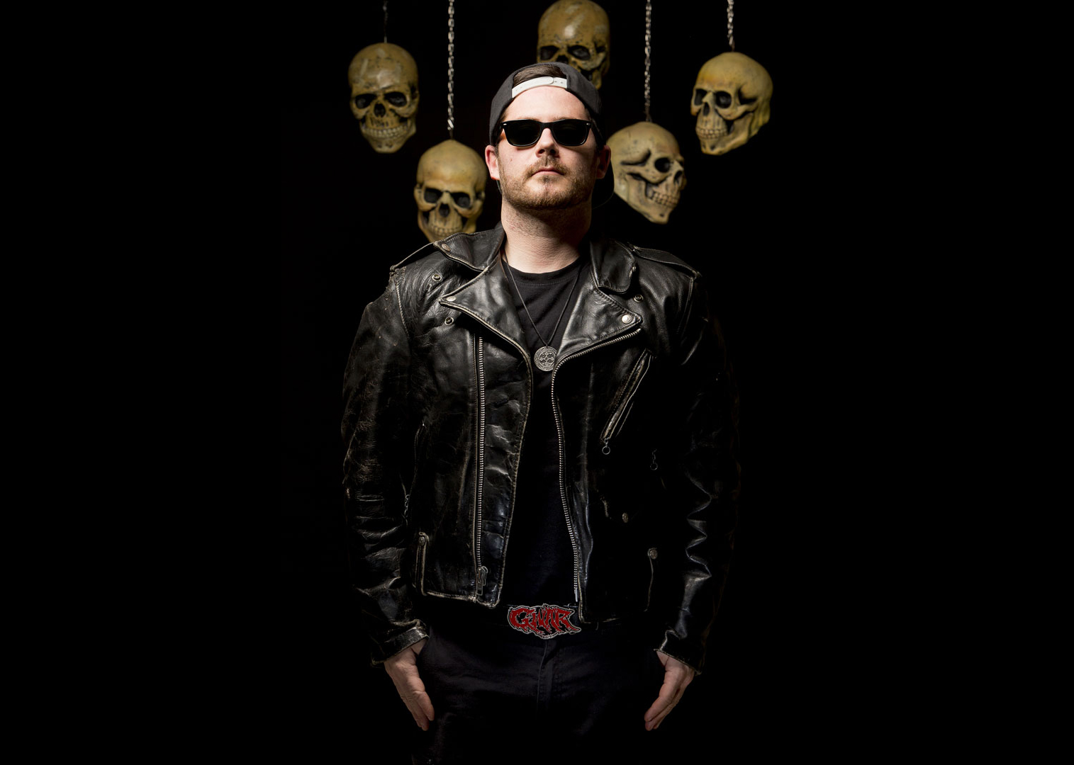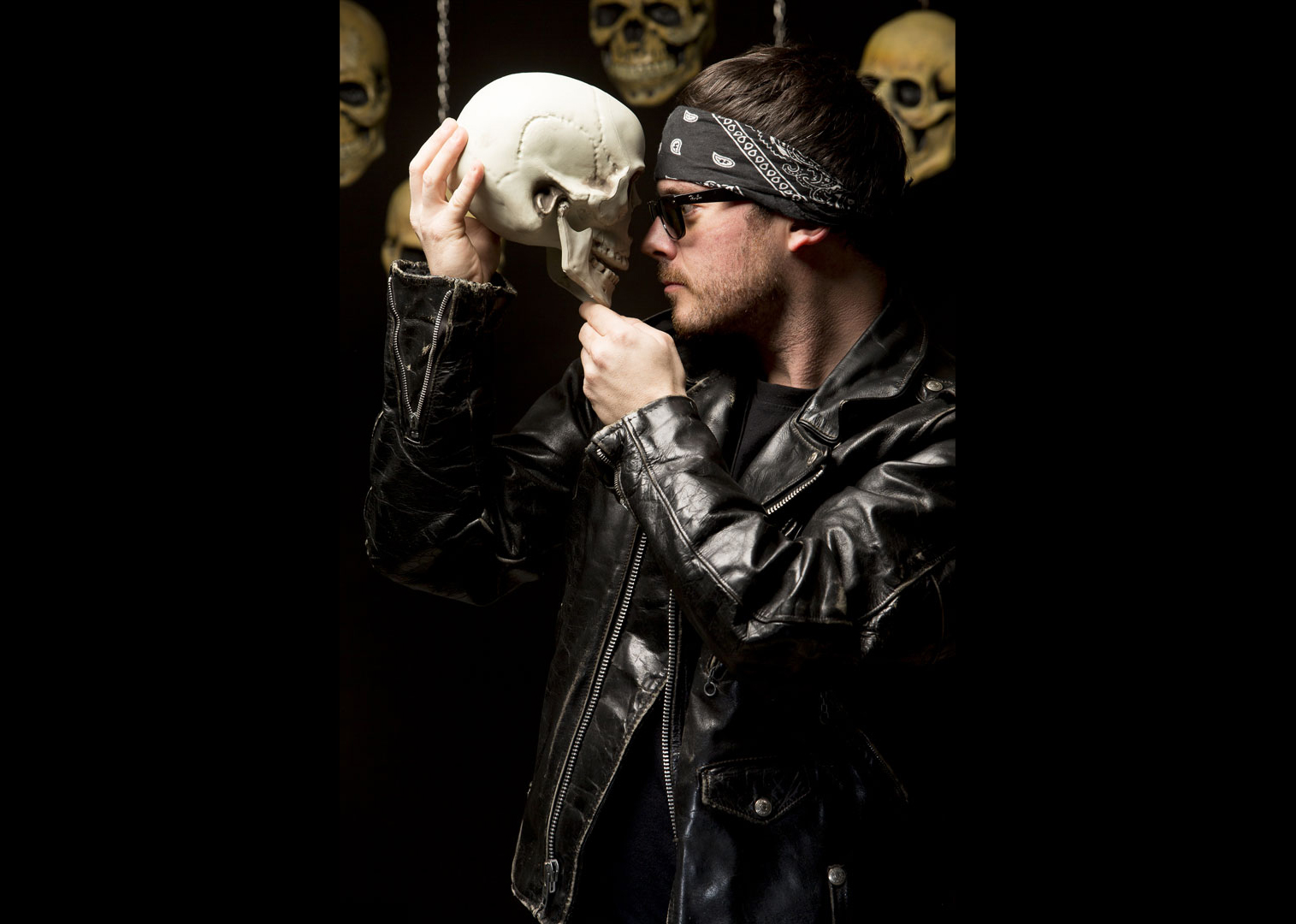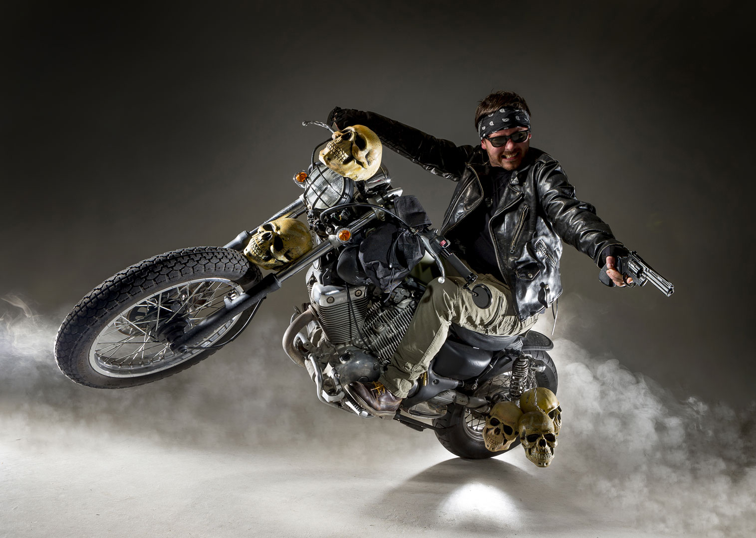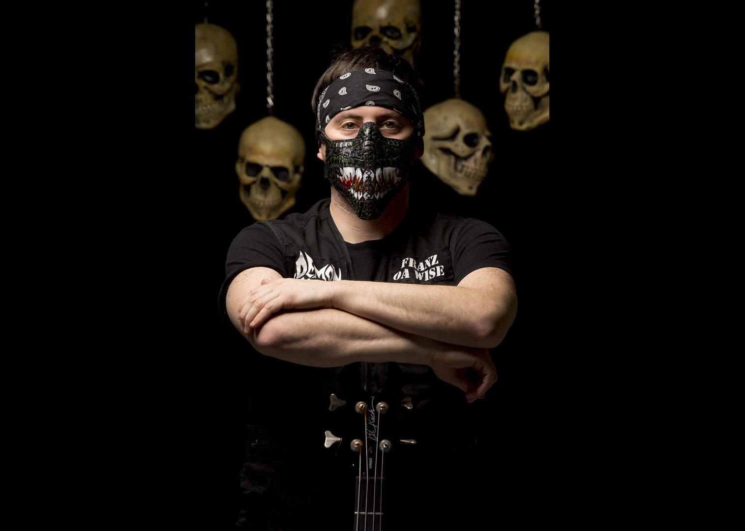 FRANZ O.A WISE actuel bassiste de DEMON VENDETTA, THE BLACK ZOMBIE PROCESSION et HELLBATS, ex membre de TEENAGE RENEGADE et NEDGEVA, représentant du label indépendant A MONSTER’S TEARS MUSIC (AMT music) s’est présenté au studio chevauchant sa YAMAHA VIRAGO en Custom Bobber US Army pour un shooting des plus funs et des plus cryptiques !